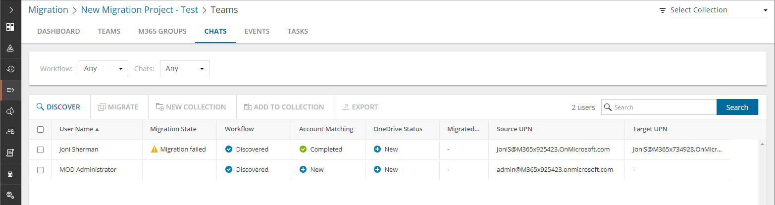 User accounts in the source tenant must be matched with user accounts in the target tenant. If new users are added to the source tenant after the Chats discovery task completes, you must match the new users and then rerun another Chats discovery task. For more information about matching user accounts, see Matching Accounts.