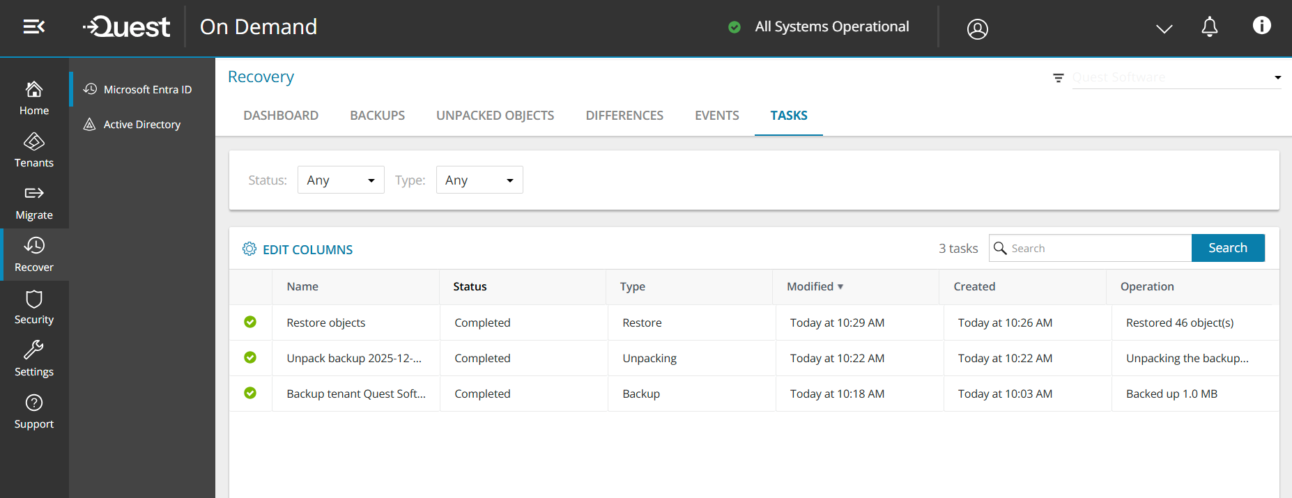 Caution: Microsoft Entra is a dynamic and rapidly evolving platform, which means its APIs may be updated or changed with limited notice. These ongoing changes may occasionally impact features in On Demand Recovery. When possible, Quest aims to provide timely notification to customers in cases of such impact. For the latest updates on Entra ID APIs, refer to the Microsoft Entra ID documentation and Microsoft Graph Changelog.
