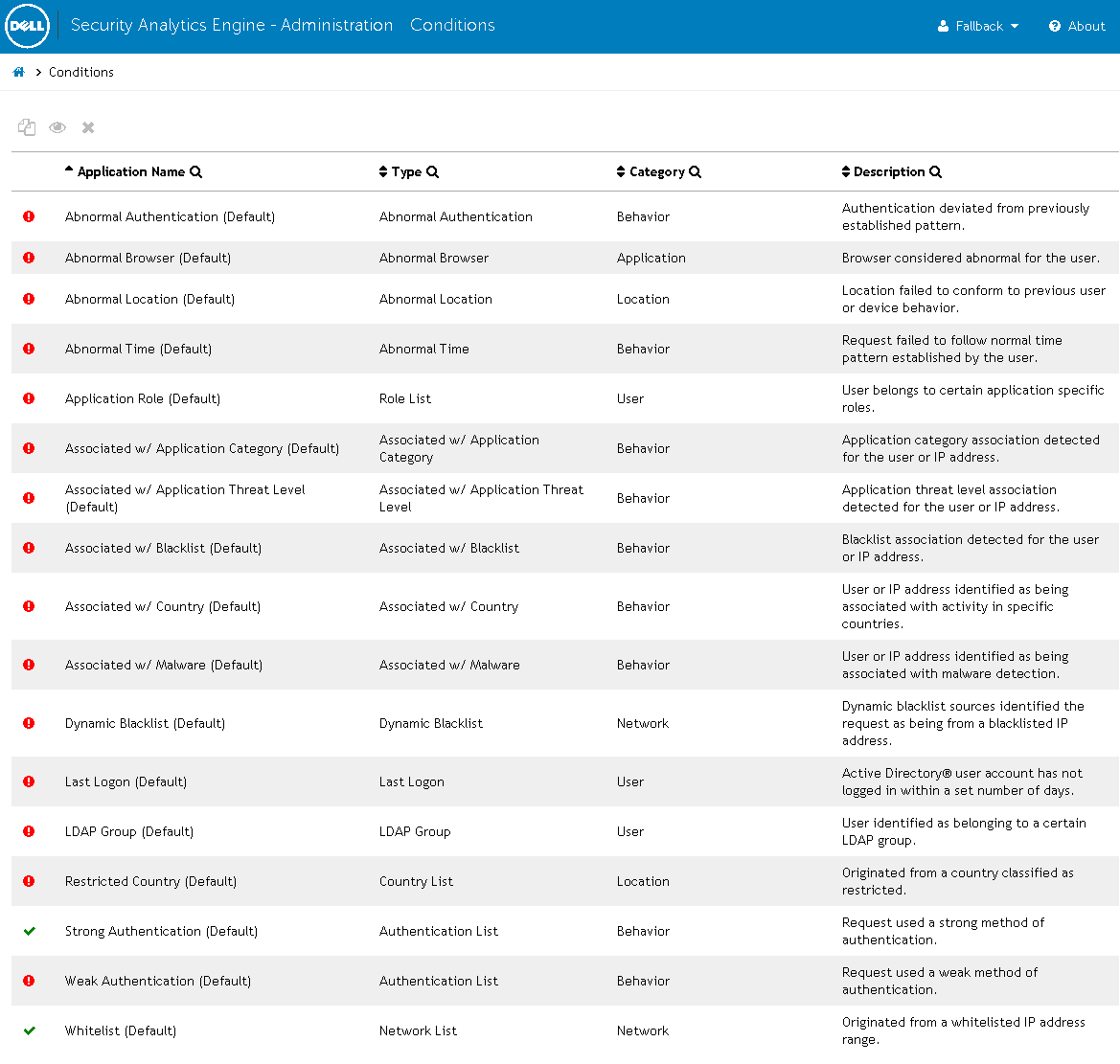 The Conditions page is displayed when Conditions is clicked on the Home page of the Security Analytics Engine Administration web page.