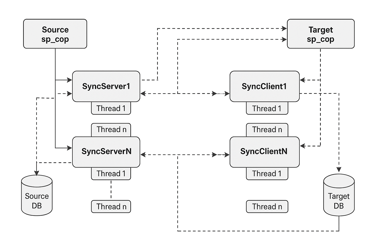 This diagram illustrates a multi-threaded architecture for synchronizing data between a source and a target system.