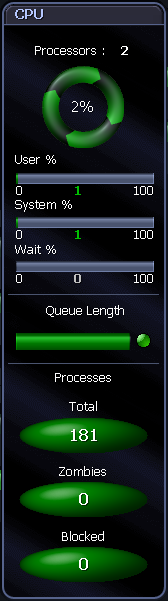 CPU Spinner The CPU load (as a percentage) across all CPUs on the machine.