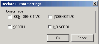 In Adaptive Server 15 or later, the Declare Cursor Setting window is also available to select specific cursor settings.