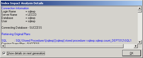 The Index Impact Analysis Details window displays information about the creation of the indexes and the retrieval of the query plans. The Index Impact Analysis Details window displays after the Index Impact Analysis process is completed unless the Show details on next generation checkbox in the Index Impact Analysis Details window is unchecked.