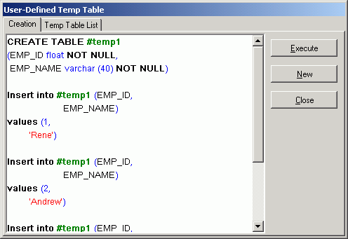 Note: Temporary tables created within the User-Defined Temp Table window can be used in all modules but the SQL Worksheet. The SQL Worksheet module creates a separate session so temporary tables created in the User-Defined Temp Table cannot be used in the SQL Worksheet and vice versa.