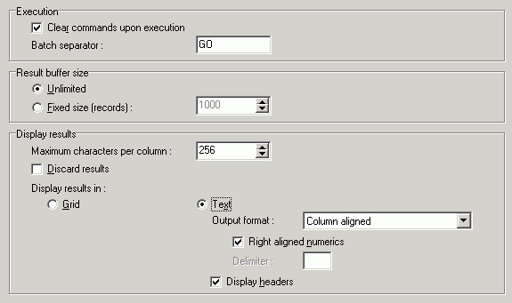 The SQL Worksheet tab of the Preferences window allows users to determine if the commands are clear upon execution, the batch separator, the buffer size for the result set, and to specify how the results sets are displayed.