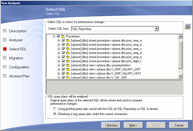 The SQL statements used in an analysis can be taken from the SQL Repository and the SQL Scanner. If you select SQL statements from the SQL Scanner, these statements are added to the SQL Repository.