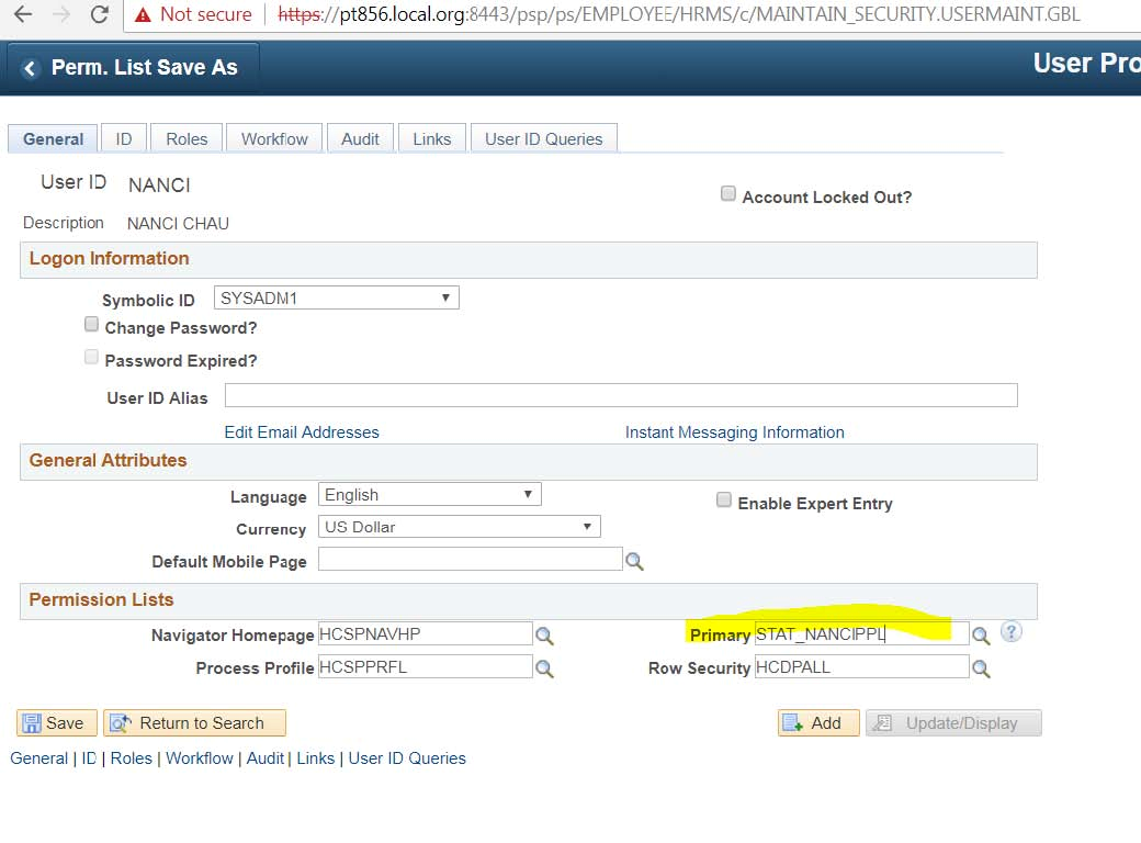 Log in to the PeopleSoft portal. Select PeopleTools | Security | Permission List and Roles. Locate the user Primary Permission List.