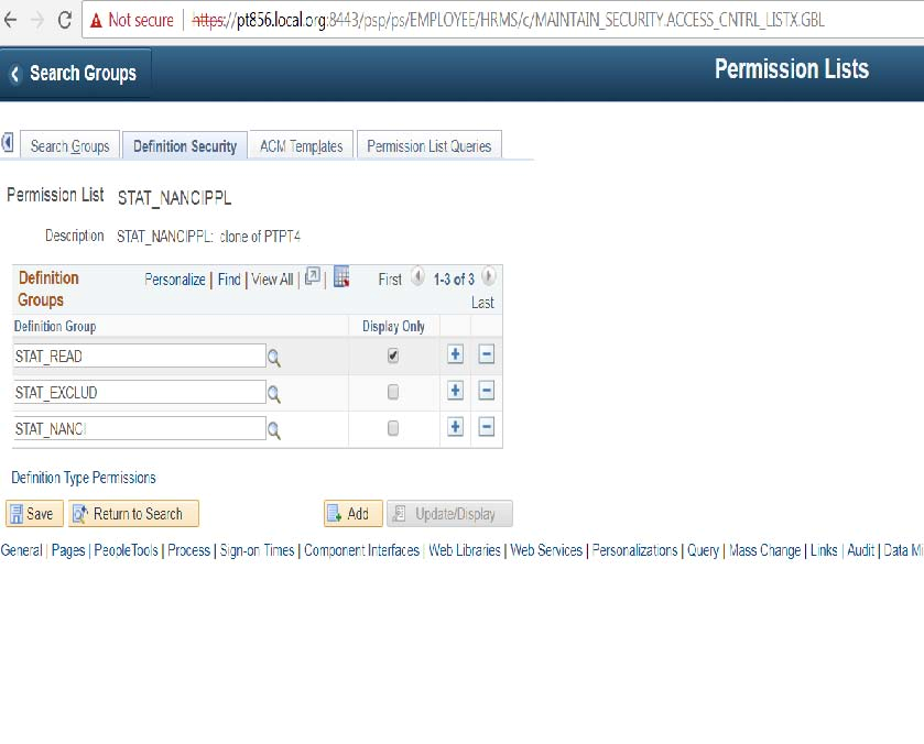 Open the Primary Permission List. Select the Definition Security tab and add STAT_READ, STAT_EXCLUD (if object types are selected for exclusion from Physical Object Locking), and STAT_PSOPRID. Set STAT_READ to display only.