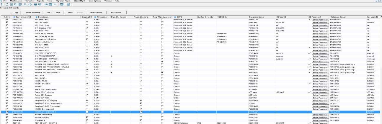 System Maintenance Service Domain Maintenance Department Maintenance Issue Tracking Maintenance Country Maintenance Customer Maintenance Object Type Maintenance PeopleSoft Environment Connection Maintenance Pre/Post Migration Steps Parameters Oracle Applications Configuration Oracle Applications Connection Maintenance Generic Application Connection Maintenance Schema Object Parameters Maintenance Data Object Maintenance PeopleSoft Search Configurations Stat Report Definition Maintenance Version Control Management Connection Maintenance