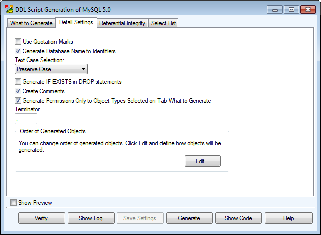 During reverse engineering, the Definer property is loaded. Nevertheless, if user does not have particular permissions, the generated DDL script with the Definer property would not work. Now it is possible to deselect this property for the DDL script generation.