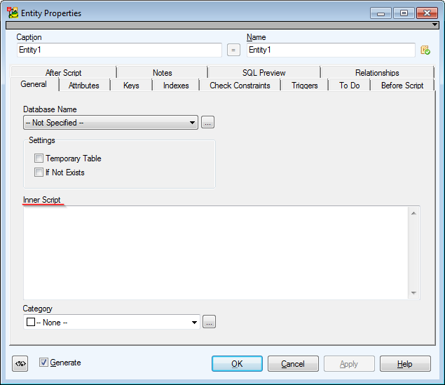 Inner Scriptbox — e.g. for defining constraint in text. Code in Inner Script is generated in the body of CREATE TABLE command, at the end after all attributes and constraints. During reverse engineering, foreign key constraint definitions, which are not possible to visualize by relationship, are loaded here.