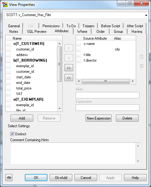 6. On tab Attributes you can select columns from the linked tables. Relationship aliases and names of entities are displayed.