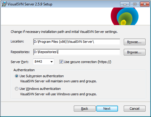 1. Define a path to your SVN Server location, specify folder for your repository and select an authentication method.