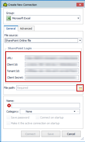 o Choose an existing file on the SharePoint Online Server (already specified through connection, or you can choose a different one), or