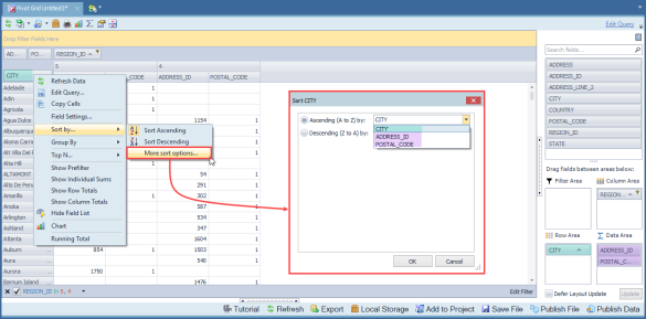 • Using the "More sort options..." from the Row or Column area context menu where you can additionally use columns from the Data area for sorting