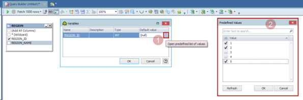 These predefined values are saved in the Query Builder, Query Editor, or Workbook file and are automatically transferred to all downstream steps in Toad (such as Pivot, Transform and Cleanse, and Dimensional View). The predefined values can also be utilized in the Set Variable System Activity in Toad Automation.