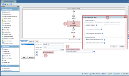 For complete details about this feature, see the Toad Data Point User Guide, sections Query > Using Bind Variables and Automation > Using Variables in Automation.