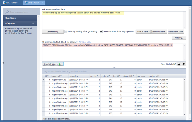 For step-by-step instructions and more details, see the AI Ask – Enhanced Data Querying with AI section of the Toad Data Point User Guide.