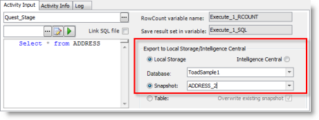 4. In the Activity Input tab, enter the following query: Select * from ADDRESS. Then select Local Storage and Snapshot in export options section.