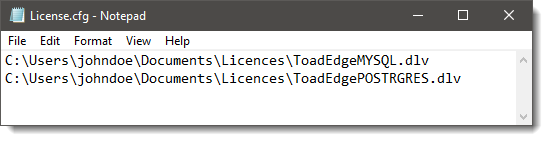 - Users can create license.cfg file at an alternative location in Toad Edge program data location, e.g. C:\ProgramData\Quest Software\Toad Edge\