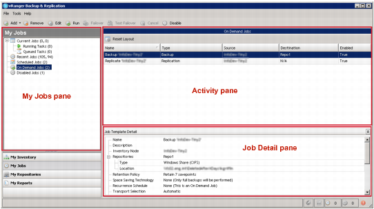 The My Jobs view consists of the My Jobs pane on the left, the Activity pane on the upper right, and the Job Detail pane on the lower right. Use this view to add, run, schedule, disable, or cancel a backup job. From this view you must have either the Scheduled Jobs or On Demand Jobs node — in the My Jobs pane — selected to add a job.