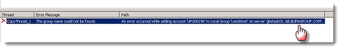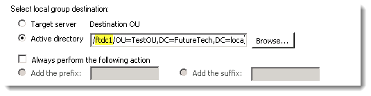 The normal LDAP string is used to target the destination OU during a migration of local groups to AD (Active Directory). When the job runs the error "Group name cannot be found" is generated although the group was created and is visible in AD.