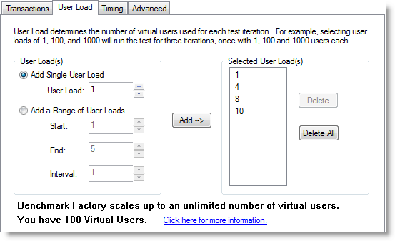 3. Add user loads individually, or specify a range to allow Benchmark Factory to calculate the user load list automatically. Review the following for more information.