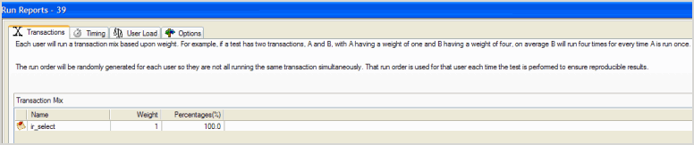 Clicking Details displays the transactions mix, timing, userload, and testing options used for the test.