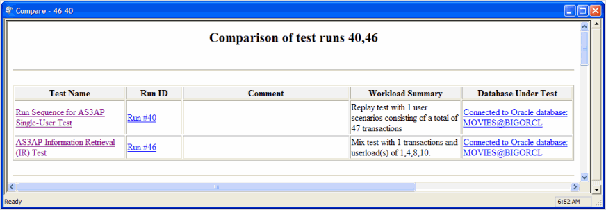 Benchmark Factory allows you to view and compare multiple results using Run Reports.