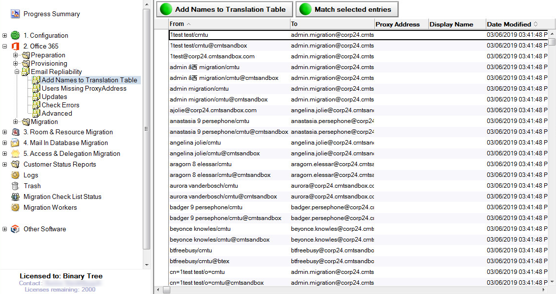 A Name Translation Table contains email addresses of Notes users and their corresponding SMTP and/or Exchange legacy Distinguished Name (legacyExchangeDN). The translation information contained in the table is used by the Migrator for Notes migration engine to look up every entry in the Domino Directory and convert it to an SMTP style address or Exchange legacyDN. Every email address found in every mail message, calendar entry, contact, or task being migrated is translated to its corresponding SMTP address (Internet address) and/or Exchange legacyDN (if available). This is required for migrated items in Exchange to have the correct email address format so that users can reply to the emails or calendar items in Outlook using the Exchange email address format.
