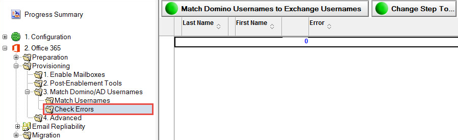 Before end user mail file migration takes place, be sure that the Notes users have matching accounts in Office 365 (in Validation). This process helps in checking if the username that is being migrated has an existing account in the new Office 365 environment. However, matching usernames is not required if you are migrating to a .pst file.