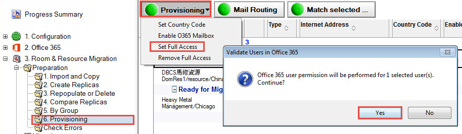 4. Next, select one or more entries and then click the Provisioning button and choose Set Full Access from the dropdown menu; click Yes in the Validate Users in Office 365 window and then enter your password in the Windows PowerShell credential request dialog box that appears; click OK: