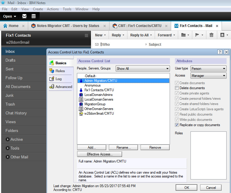 To check the mail file ACL, in the Notes client, with the mail file open, navigation to File | Application | Access Control. The currently logged in Notes ID should be listed as a Manager on the mail file: