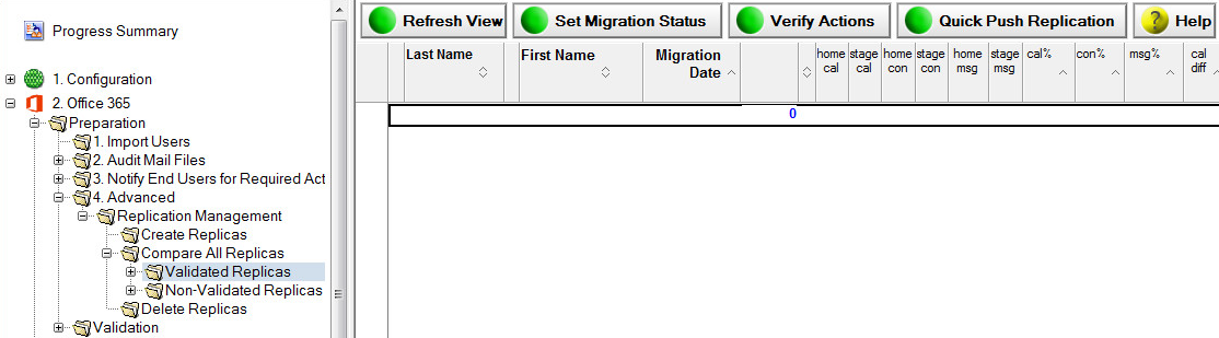 This view gives you the ability to refresh the view, set migration status, verify actions, and quick push replication; click the Help button for more information about the replica comparison view; Quick Push Replication uses the information defined in the Replica Settings to initiate a push from the mail file to the staging replica