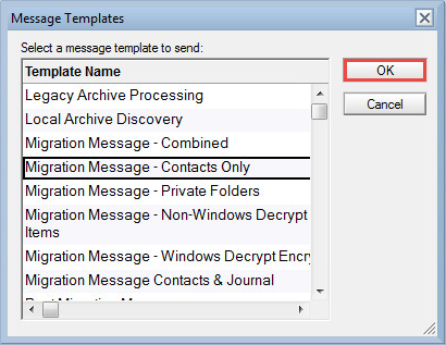 In the Message Templates dialog box, a list of available predefined templates is displayed. If you have created custom templates, these will also be listed; select the template you wish to send and click OK; for example, select the Migration Message – Windows Decrypt Encrypted Items message template, and then click OK: