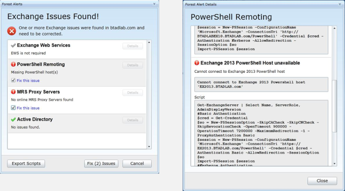 Clicking on the icon will bring up dialog boxes to help in troubleshooting. You can click the Details button for more information. This information also displays the relevant PowerShell script that is used to troubleshoot the issue.