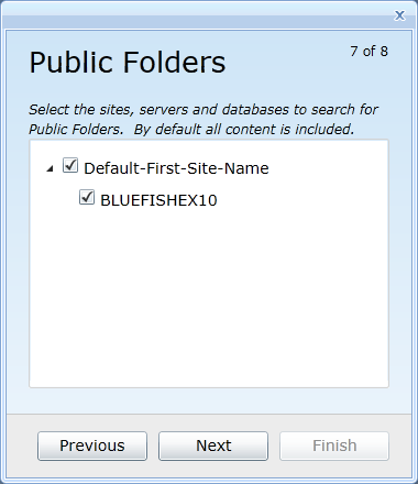 Select the sites, servers, and databases you want Migrator Pro for Exchange to search for public folders to migrate. All content is selected by default.