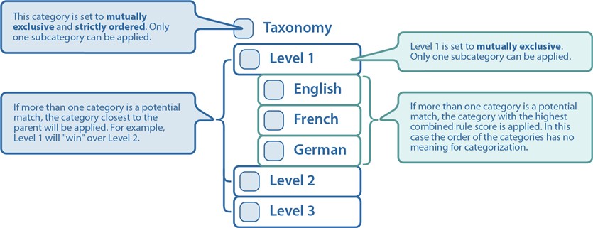 • If all potential categorizations share the same parent, and that parent is mutually exclusive, only one potential category will be applied. The category that will “win” is the one with the highest combined rule score. This means that if you are planning a mutually exclusive taxonomy or branch of a taxonomy, it is important that you ensure the relative weighting of all subcategories makes sense for your needs. For more information, see How Rules Affect Categorization and Advanced Rule Applications