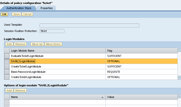 Under Login Modules, click Add. Choose SAML2LoginModule from the dropdown list. Click Add again, and choose CreateTicketloginModule from the list.