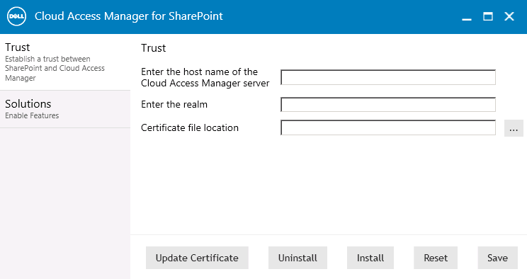 Complete the fields on the Trust tab. You can obtain the realm value from the Cloud Access Manager SharePoint application configuration, Federation Settings | Relying Party Realm / Identity.
