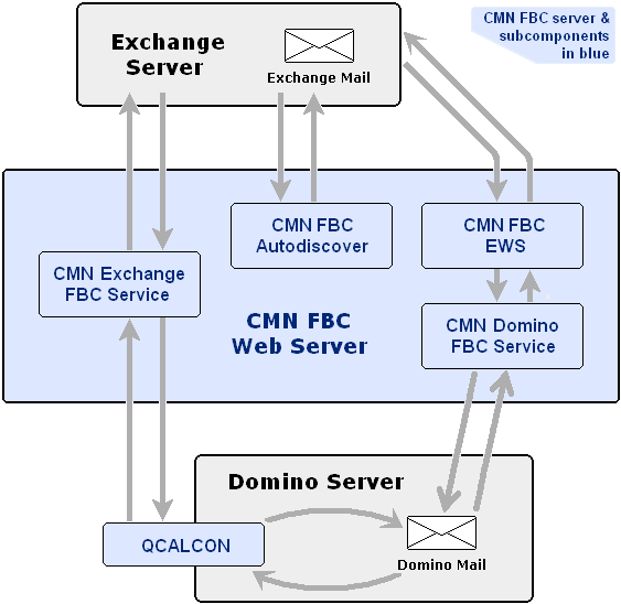 QCalCon: A Domino server task for communications between the Domino and Exchange servers (Exchange F/B queries to Domino, and Domino’s F/B information)—performing essentially the same function for Domino that the F/B EWS performs for Exchange. |