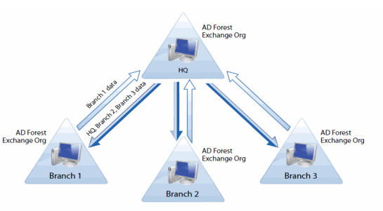 This architecture optimizes synchronization traffic load balancing and makes deployment easy. Each forest participating in the collaboration sends its data to be published to the HQ forest, and the HQ forest distributes to each branch forest the data it requires. Thus, the HQ forest provides data distribution and manages the data flow between all collaboration partners.