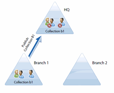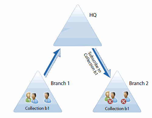 Before a forest subscribes to a collection, the only information available for the forest’s administrator is the collection name, a short collection description provided by the collection creator, and the publishing forest’s description. A collection’s membership (that is, the objects it contains) is available only after its administrator subscribes to the collection. By subscribing to a collection, branch administrator can control which objects and attributes from a collection are applied to his or her forest on per object and per-attribute basis.