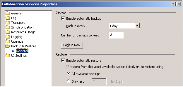 Use the Backup & Restore page of the Collaboration Service Properties dialog box to adjust the backup and restore options.