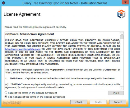 • A file level backup of the Directory Sync Pro configuration files on the Domino and Windows servers (nBTDirSync.EXE.Config and BinaryTree.DirSync.Exchange.exe.Config).