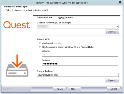 7. The Database Server Login screen appears again, this time for the logging database. Enter the SQL Database Server location for the logging database, credential information, and database name. Click Next to continue.