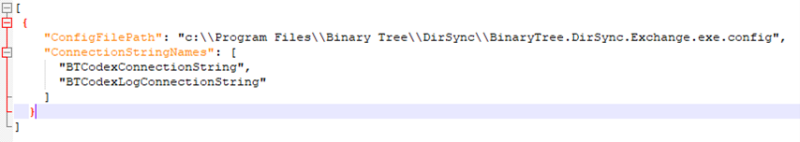 For the Windows Console Server installation this would update the BinaryTree.DirSync.Exchange.exe.Config which has a default installation location in C:\Program Files\Binary Tree\DirSync and the GlobalConnectionStrings.config which has a default installation location in C:\Program Files\Binary Tree\DirSync\WebUI