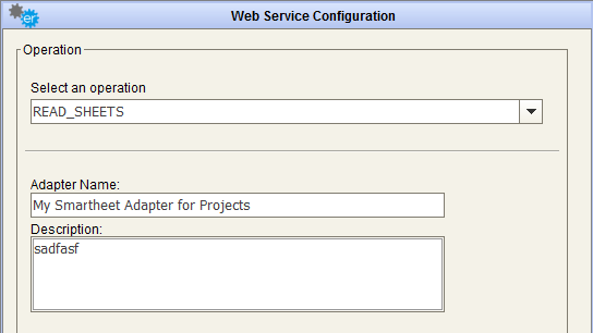 To use the adapter for SmartSheet, fill the field “Web Service Home URL” with the SmartSheet home page URL you want to connect to.