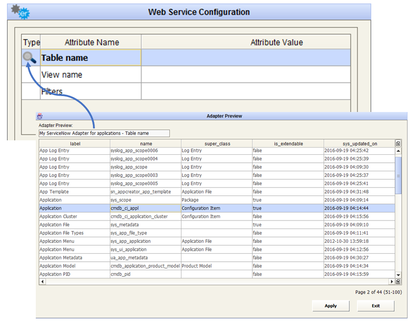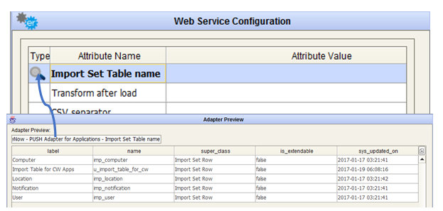In case of ServiceNow “push data” operation, with the double-click on the lens icon, a table appears, with the available import set tables: