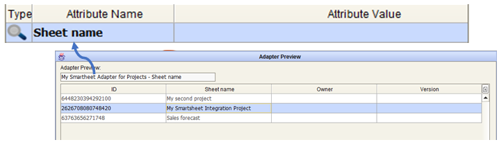 In case of SmartSheet “read sheets” operation, with the double-click on the lens icon, a table appears, with the available sheets to query: